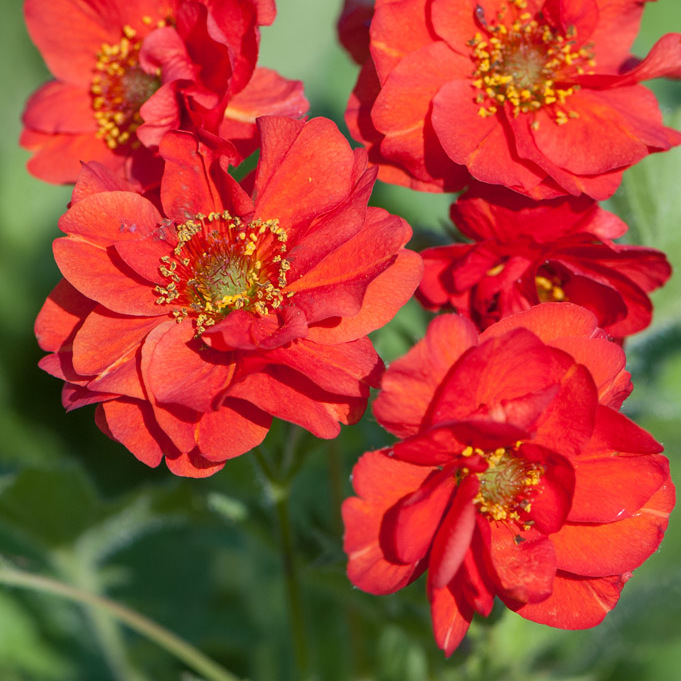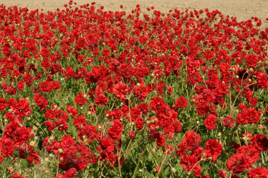 Семена геума махрового Блэйзинг Сансет выращивают для оформления садовых объектов и для срезки. В середине лета на кустах распускаются махровые цветы с лепестками насыщенно-красного оттенка, собранные в букеты по 5–8 штук. Цветение продолжается до конца лета.