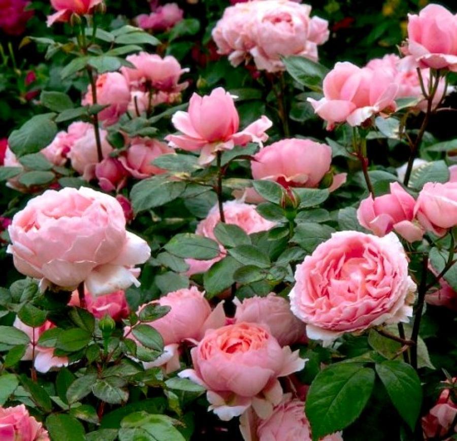 Рассада розы кустовой Бразе Кэдфэл (Brother Cadfael): один из самых эффектных сортов английских роз, зачаровывает нежными, будто светящимися розовыми цветами. Благодаря округлым, загнутым внутрь лепесткам, соцветия похожи на пионы. Аромат приятный и весьма сильный. Несмотря на большие габариты, кусты выглядят опрятно и гармонично. Идеально подходят на роль основы цветочной композиции. Побеги прямые и прочные, листья темно-зеленые, округлые. Многолетник продолжительно цветет, почти весь сезон, и завязывает семена. Особенности розы Бразе Кэдфэл: