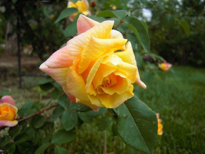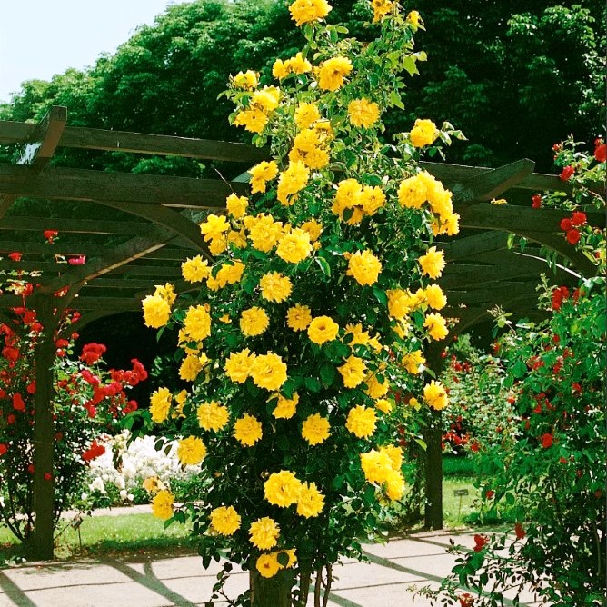 Саженцы розы плетистой Голден Парфюм (Golden Parfum) обрадуют любителей высокорослых ярких и ароматных роз. Растение обладает не только насыщенным запахом, но и поражает взгляд обильным цветением желтых махровых бутонов. Как правило, растение пускают обвивать арку, забор или стену беседки, создавая уютный романтический уголок на участке.